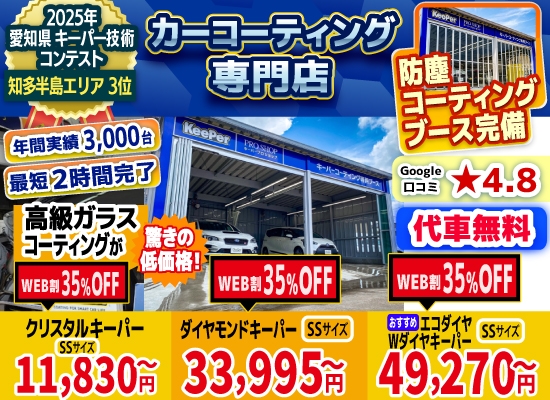 私達キーパープロショップは、知多市・常滑市・半田市・大府市・東海市・高浜市・東浦町・武豊町・阿久比町エリアのカーコーティング専門店として、